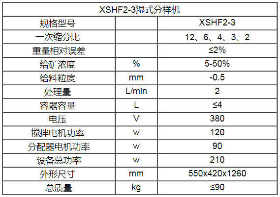 XSHF2-3型湿式分样机适用于实验室作矿浆等量缩分及试验产品的湿式分样用。通过湿式分样机可得到在固体含量、粒度组成及化学组成上保持代表性的小量试样。该机是冶金、地质、建材、化工、煤炭等工业部门的生产科研,试验和院校等单位湿法缩分矿浆的设备,重量相对误差≤2%。矿浆经调浆搅拌桶搅匀后,给入过流漏斗。然后流入带匀分锥的矿浆分配器。分配器为一匀速转动体。矿浆经它分成八等份。再分别均匀给入截料漏斗中。漏斗12只。每只占有360°/12=30°的弧长。从而保证了在单位时间内各漏斗截取的矿浆量相等。所以利用XDHF2-3型湿式分样机完成矿浆缩分过程,可保证所得试样在固体含量粒度组成和化学组成上保持代表。